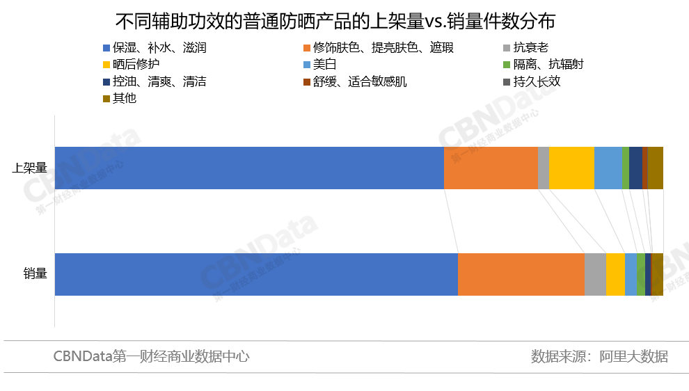根据CBNData报告显示,除了基本的防晒和滋润功能,消费者还对修饰肤色、提亮肤色、遮瑕还有抗衰老等辅助功效的防晒产品有着较高的购买需求。