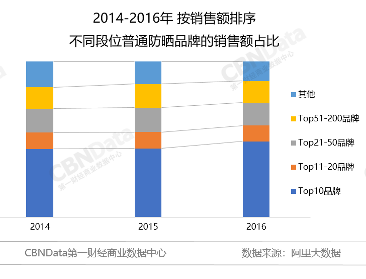 根据CBNData数据显示,2017年二季度防晒品类销售额同比提升48%!这个高增长趋势也吸引了众多商家陆续进入防晒市场。但是,近年来防晒头部TOP10品牌集中度正逐年提高,尾部空间收窄,整体市场正在进入品牌整合期。