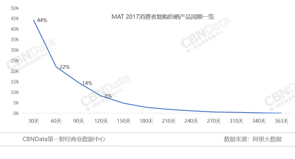 她们不仅消费实力强劲,剁起手来更是短、频、快。数学委员发现,44%的消费者会在30天内再次购买防晒产品。除此之外,还有近四成的消费者会在60-90天内完成复购。按照娜扎在节目中走到哪都得喷一喷的使用频率来看,一瓶防晒霜确实不够用。